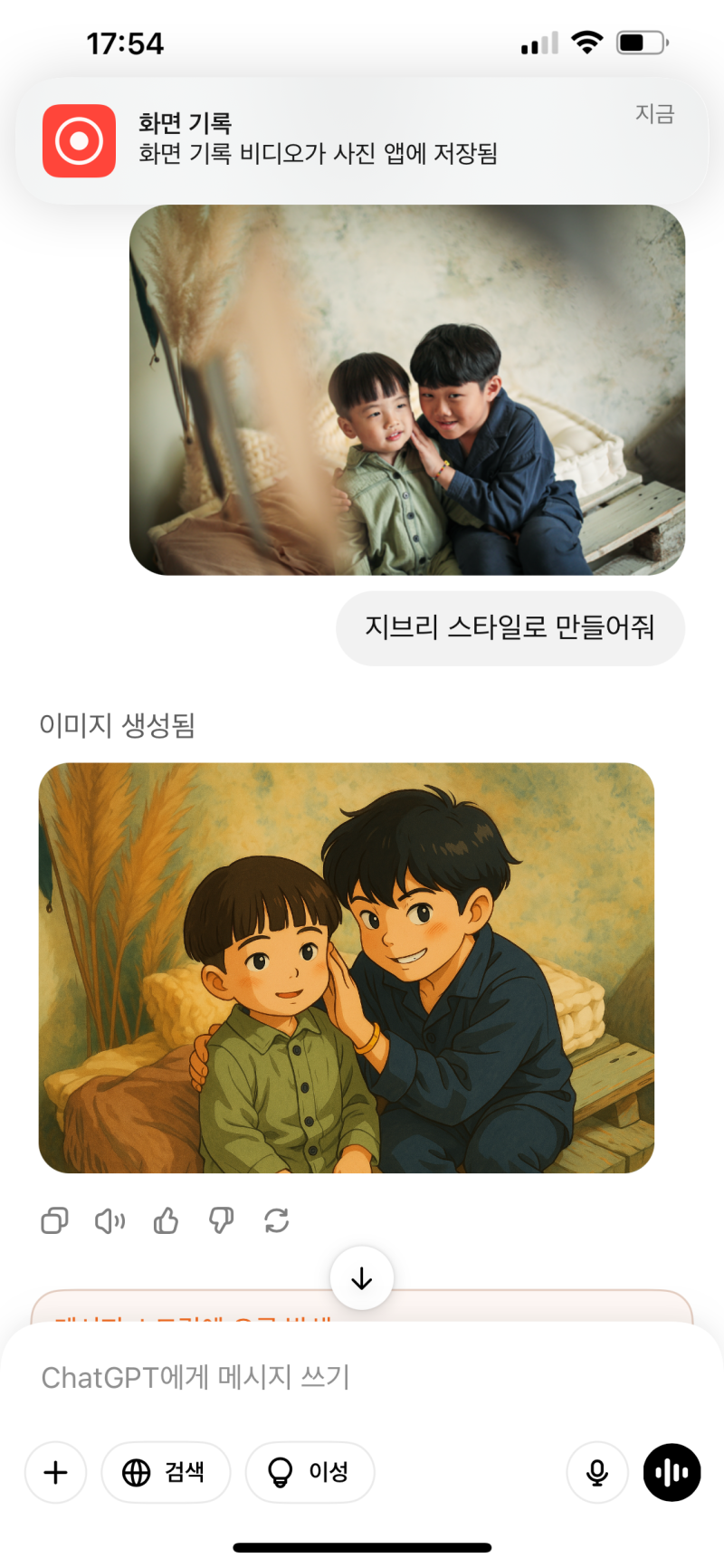 이미지를 업로드하고 “지브리스타일변환 해줘”라고 요청하면,